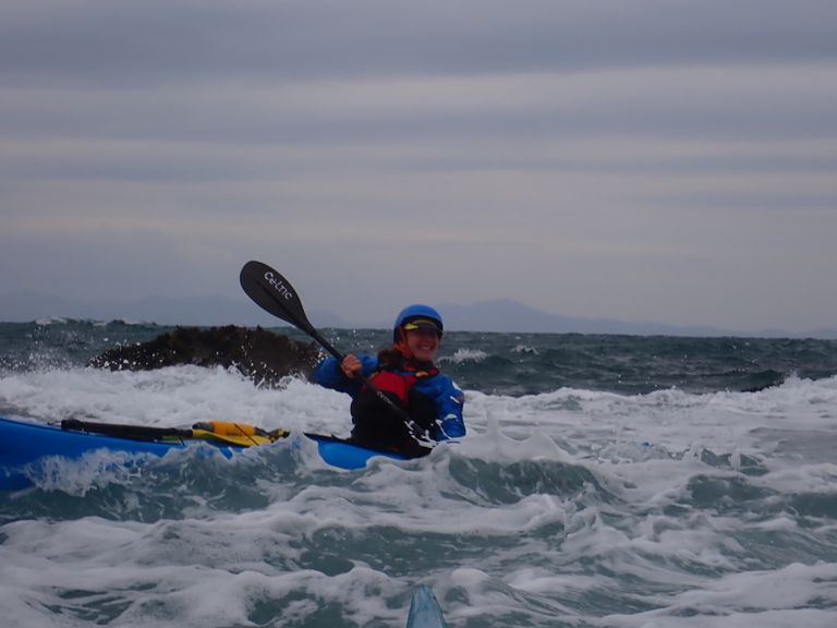 After lunch we checked out the tide race but it had died away and wasn’t great for play so we did some skills along the cliffs. The challenge was to paddle in the swell right along the wall and try and touch it. Craig then had us practicing rescues along the cliffs. I popped a tow on when a rescue was taking a little too long due to a paddle getting blown out of reach. Afterwards Craig said I was always where he needed me. I can’t seem to turn off playing back-stop even when I’m on a training course.